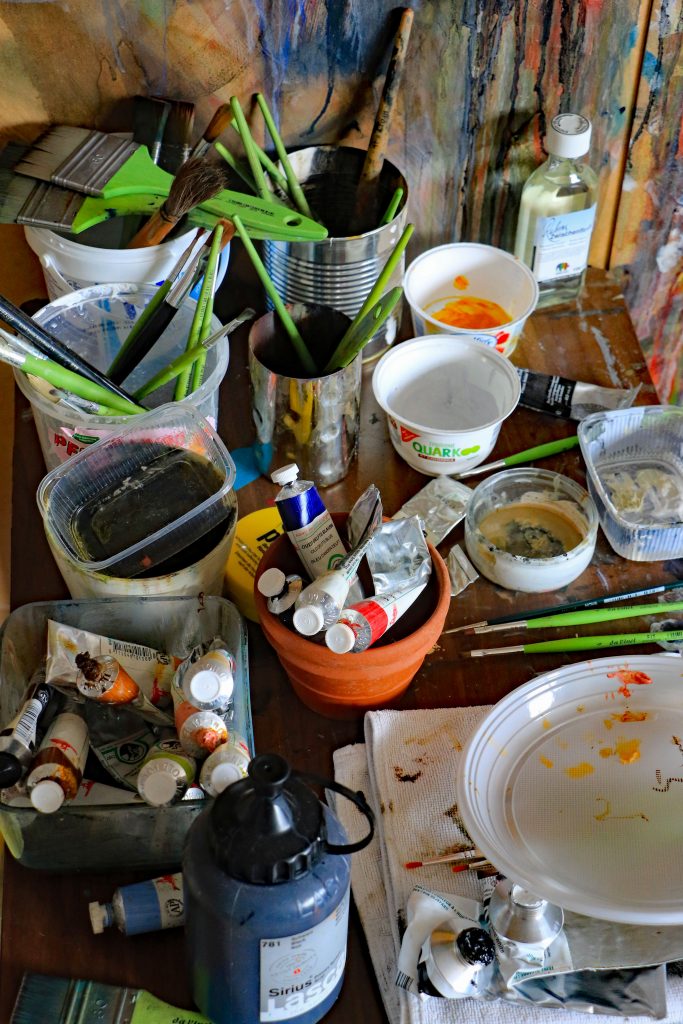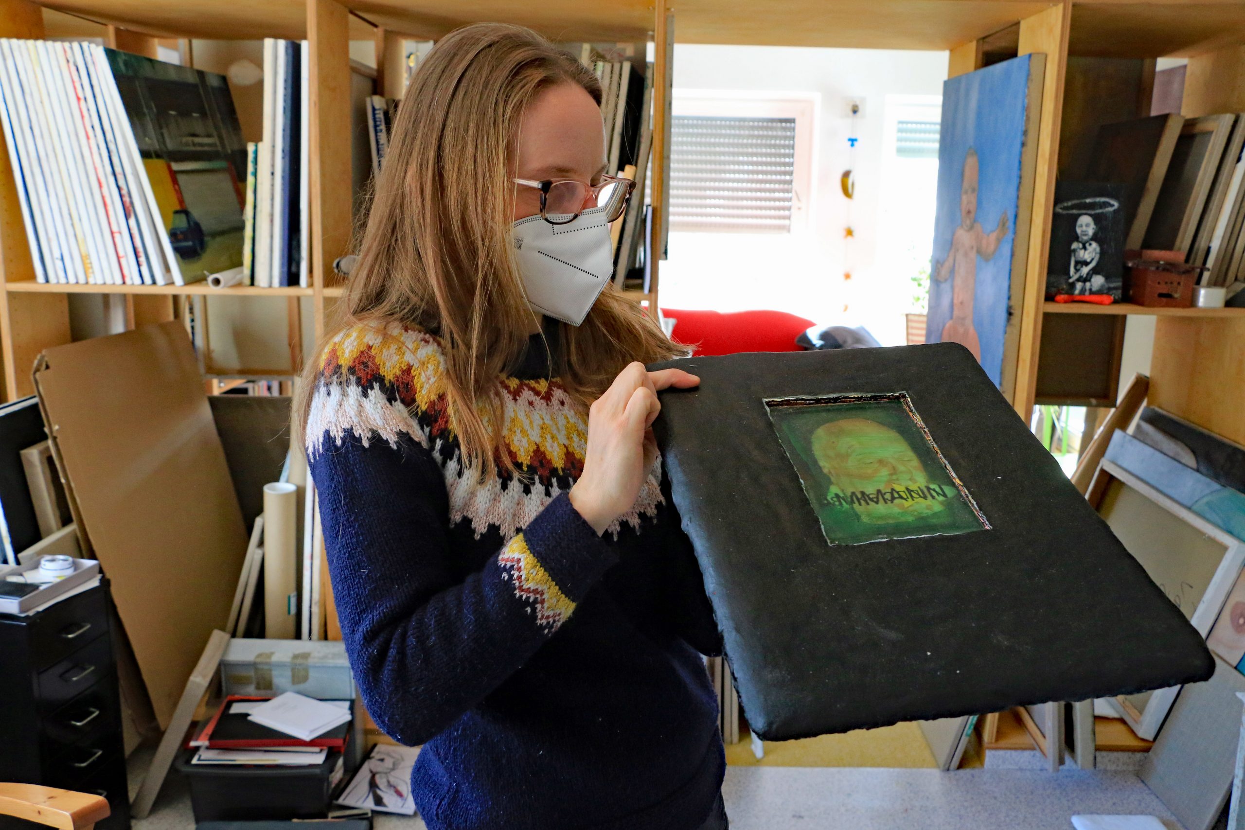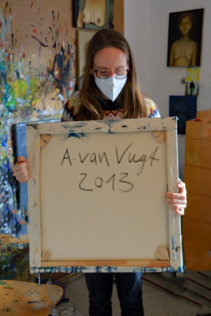 Das großzügige Atelier in Siegbach-Eisemroth entspricht fast eins zu eins meinen Vorstellungen von dem kreativen Arbeitsplatz eines Malers. Im vorliegenden Fall war es aber eine Malerin, die mir die Tür öffnete. Jung, hübsch und sehr sympathisch ist der erste Eindruck und der sollte sich schon nach kurzer Zeit bestätigen. Die FFP 2-Maske verdeckt leider den größten Teil des Gesichtes von Annika van Vugt, aber für das Aufmacherfoto macht die 37-Jährige eine kurze Ausnahme.