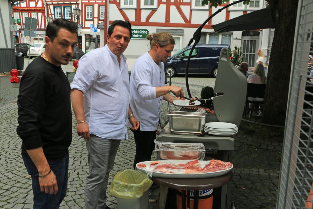Seit Christi Himmelfahrt 2020 betreibt Niko Mylonaki das „Herborner Café am Kornmarkt“. Anlass genug für den erfahrenen Gastronomen- er betreibt schon seit vielen Jahren auch das Steakhaus „Bolero“ am Wetzlarer Kornmarkt 7-sich bei seinen Gästen für deren Treue, während der Corona-Pandemie zu bedanken. Am Samstag lud er zu einem griechischen Grillabend mit Lammsteaks und Würstchen nebst leckeren Beilagen in seine ausgedehnte Außengastronomie vor dem Café ein. Das Wetter hielt und über die große Beteiligung freute sich der Wirt und sein gesamtes Team. Niko hatte eigens einen Koch verpflichtet, der sein Handwerk in einem Leipziger Luxushotel ausübt. Das machte sich für die Gourmets mehr als bezahlt. Für viele Stunden wurde aus dem Café am Kornmarkt ein Schlemmerlokal, dass keine Wünsche offen ließ. Die Bildergalerie vom Samstagabend soll einen kleinen Einblick in den gelungenen Abend geben. sig