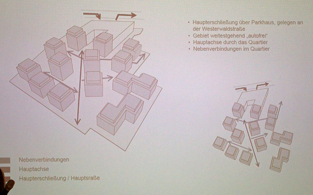 Interessant in diesem Zusammenhang: Die Zufahrt zum Wohngebiet ist vom Parkhaus aus nicht möglich. Vor den geplanten Häusern sollen jedoch pro Haus wenige Kurzzeitparkplätze eingerichtet werden, um zum Beispiel Einkäufe auszuladen. Danach müssen die Fahrzeuge wieder durch die Siedlung über Austraße und Westerwaldstraße zurück ins Parkhaus gefahren werden.