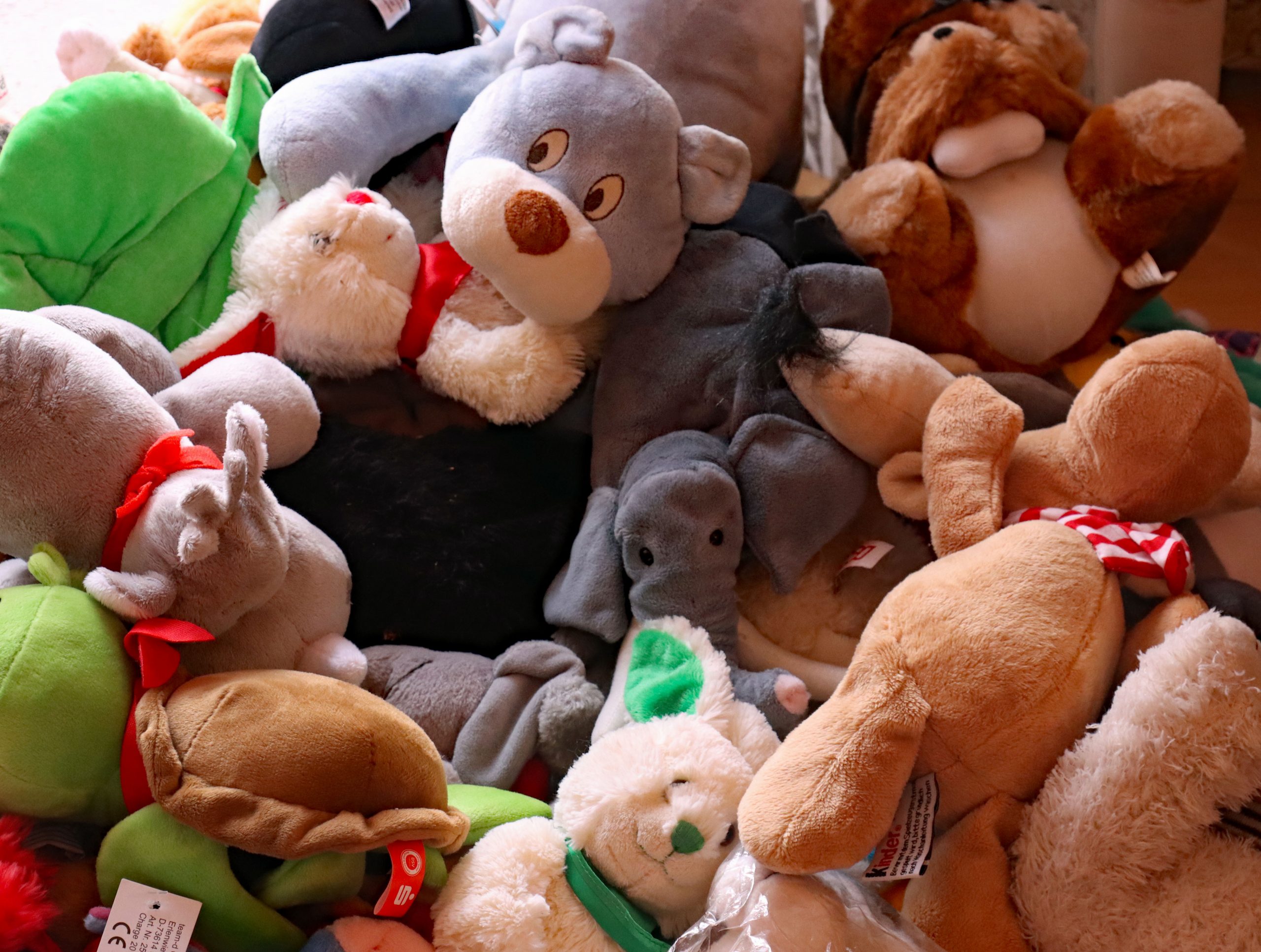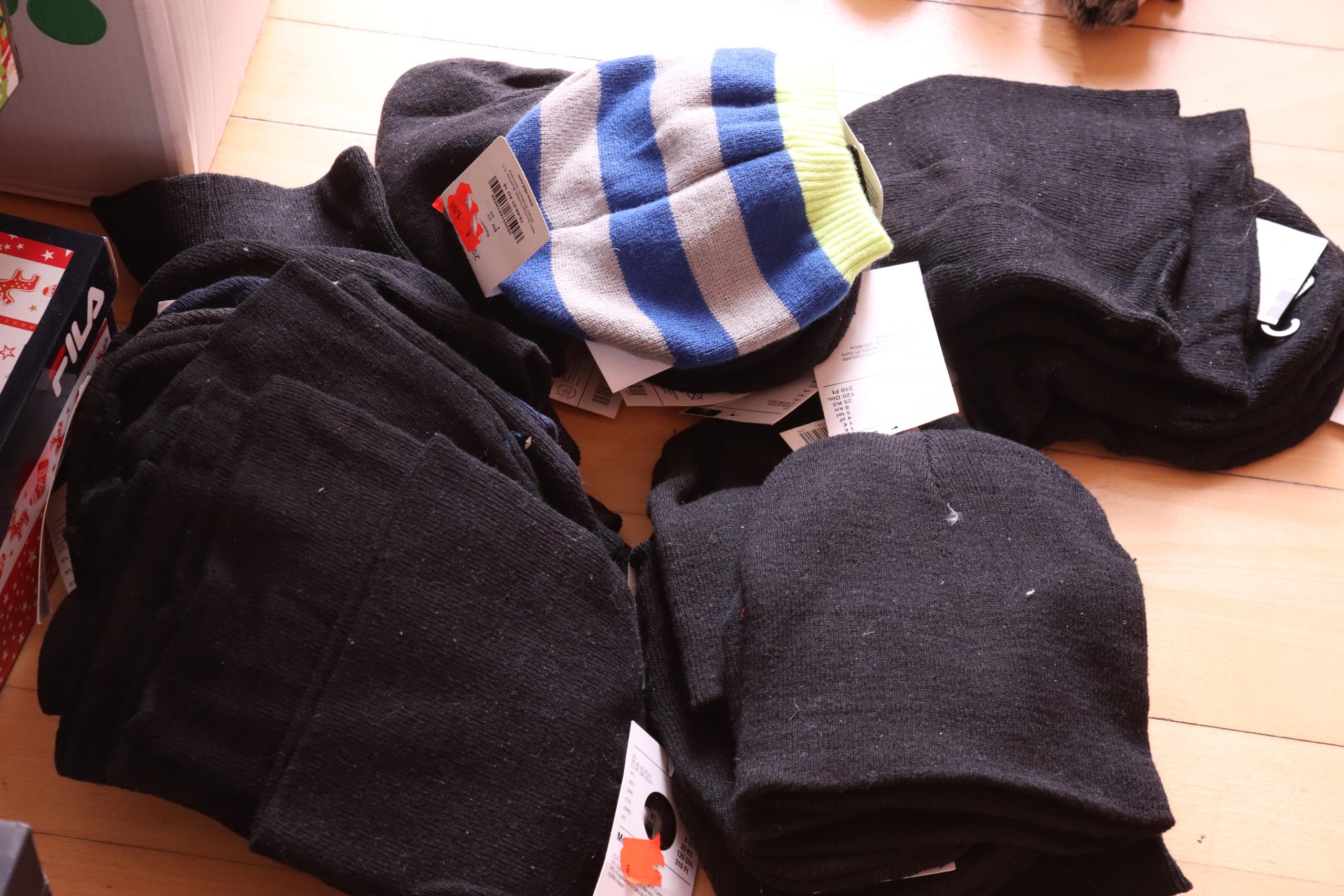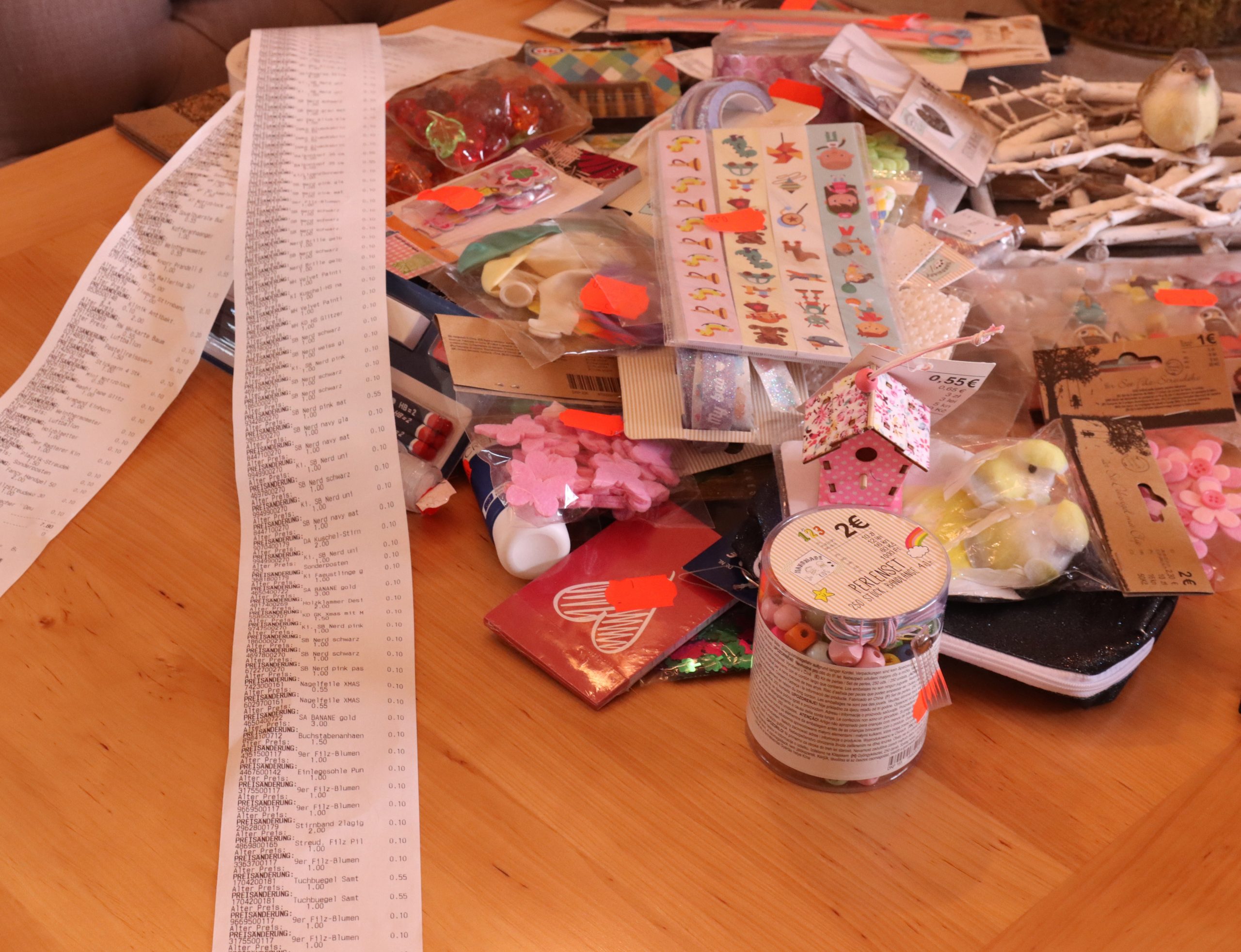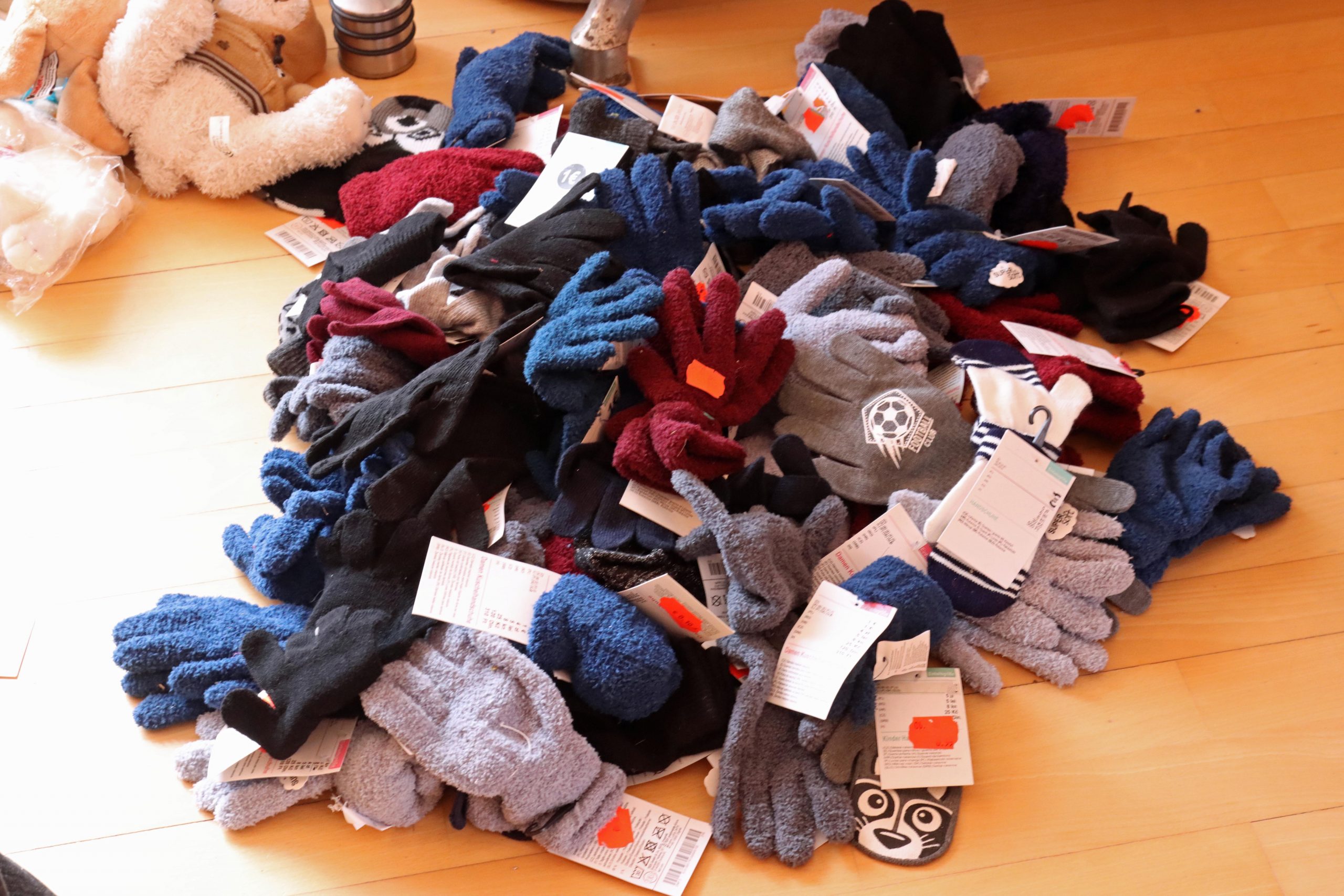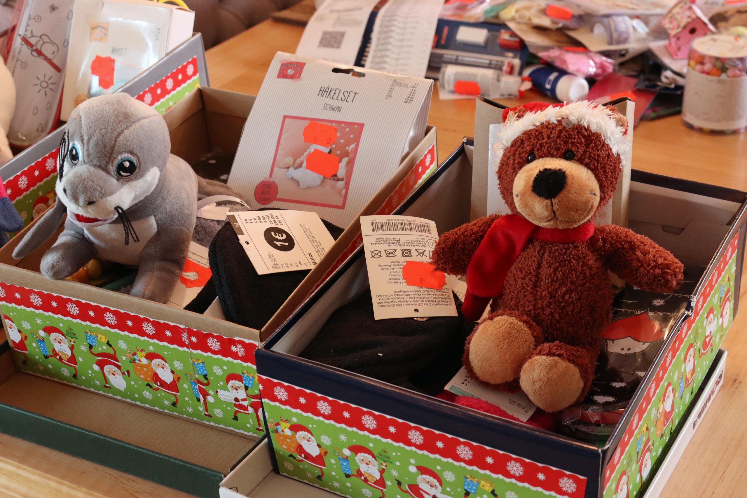 Die leeren Schuhkartons bekommt Alexandra von einem Haigerer Schuh-Discounter. Die muss sie alle weihnachtlich bekleben und mit einem Hinweis auf Alter und Geschlecht außen versehen. Der Einkauf für den Inhalt der Schuhkartons ist abgeschlossen, wie man an den teilweise meterlangen Einkaufs-Bons leicht erkennen kann. „Die Kassiererinnen müssen bei mir schon Geduld haben und die Kunden hinter mir an der Kasse auch“, lächelt sie. Dann beginnt die Füllarbeit. Es gibt für alle eine sogenannte Grundausstattung. Das sind auf jeden Fall zwei Schulhefte, zwei Tafeln Vollmilchschokolade, Bonbons (nicht gefüllt), Kaugummistangen, Zahnpasta und je eine Zahnbürste. Den Rest füllt sie nach eigenen Vorstellungen und Erfahrung auf. Immer dabei ist jedoch ein kleines Kuscheltier.