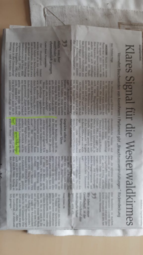 In einem Schreiben an die Gemeindevertretung äußerten die Anwohner ihr Unverständnis darüber, dass man statt einer erbetenen parlamentarischen Stellungnahme auf das Schreiben, erst in der heimischen Zeitung von parteiübergreifenden „Bekenntnissen“ für die Kirmes lesen musste. Dort sei vom dringend notwendigen Erhalt einer Brauchtumsveranstaltung die Rede. Die heutige Kirmes habe jedoch in der heutigen Form mit ihren traditionellen Wurzeln keine Gemeinsamkeit mehr. So läge auch die Lärmschwelle jenseits von gesetzlichen Normen und körperlichen Belastbarkeit.