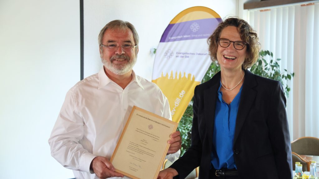 In der Regel überreicht der Dekan die Urkunde. Doch beim Dekanatskonvent, der heute am 20. August 2025 im evangelischen Gemeindehaus in Sinn-Fleisbach tagte, war die Kirchenpräsidentin als Referentin zu Gast. Dekan Andree Best bat sie dem Jubilar höchstpersönlich die von ihr unterzeichnete Urkunde zu überreichen. Dem kam Dr. Christiane Tietz gerne nach und dankte Pfarrer Reiner Lepper aus dem „Nizza des Westerwaldes“ für seinen langjährigen Dienst. Dekan Andree Best gratulierte dem Gemeindepfarrer mit einem guten Tropfen Wein. Pfarrer Reiner Lepper war bis 2006 als Pfarrer in Weilmünster tätig, von 2006 bis 2010 war er Pfarrer im Ambachtal und wechselte dann 2010 in seinen Heimatort nach Nenderoth.