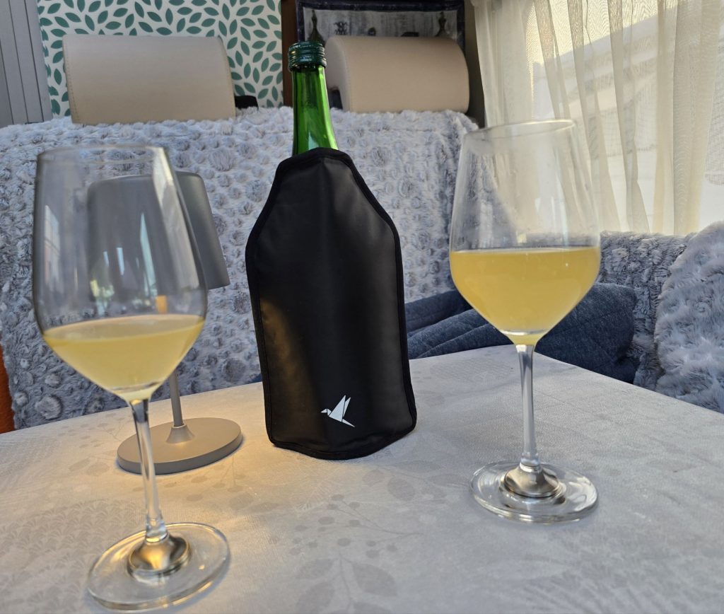 Etwas weiter hat sich ein „Stuhlkreis“ etabliert und die meisten der Teilnehmer outen sich unüberhörbar als Wohnmobilisten aus NRW. Udo Loosen hat heute seine gemütliche Straußenwirtschaft nur bis 19 Uhr geöffnet. Claudia: „Wir müssen ja auch einmal in der Woche kürzer treten.“