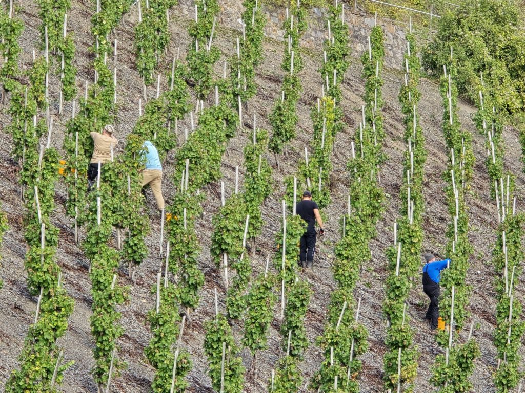 In den Moselsteillagen sind Pflückerkolonnen noch im Einsatz. Mit der immer mehr abnehmenden Man-Power steht und fällt alles.