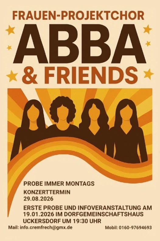 Alle Abba-Fans und Anhänger guten Chorgesangs sollten sich den 29. August 2026 gut merken. CremFrech-seit über 30 Jahren DER Frauenchor in Herborn-wird mit einem Abba-Revival- Konzert im Merkenbacher Bürgerhaus begeistern. Dazu haben die umtriebigen Damen des Vorstandes einen eigenen Frauen-Projektchor gegründet. Gemeinsam mit Freunden, die noch 8 bis 10 Lieder beisteuern wollen, werden sie dann unter dem Namen „Frauen Projektchor ABBA & Friends“ im Herborn-Merkenbacher Bürgerhaus gastieren.