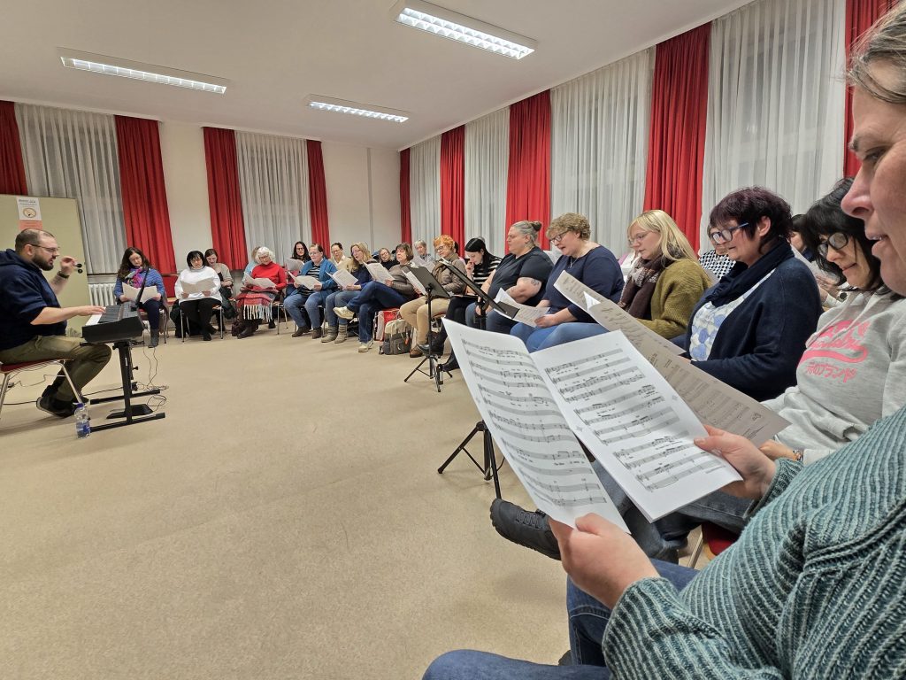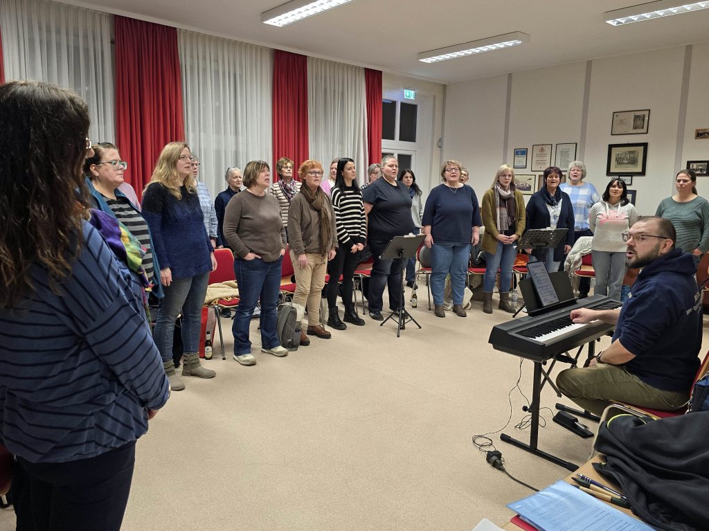 Die Idee zu diesem, bisher einzigartigem, Projektes der Formation, stammt von Sarina Hagner Gros, Iris Stanelle und Chorleiter Marcin Murawski. Der 44-Jährige Profi spielt Keyboards, Klavier, Fagott und Akkordeon. Dazu hat er einen Master Abschluss in Musik sowie Musikpädagogik und ist seit elf Jahren Chorleiter in Deutschland. Mittlerweile leitet er sieben Chöre im weiten Umkreis. Im Oktober 2024 übernahm er Crem Frech von dem bekannt und beliebten Chorleiter Leuthold Ortelbach. Einen reinen Frauenchor hat Marcin in seiner bisherigen Laufbahn noch nicht geleitet. Er habe jedoch keine Angst vor Frauen, erklärte er schmunzelnd. Gemeinsam mit ihm wollen die Herborner Sängerinnen einen neuen Weg im Chorgesang gehen und wenn man die erste Probe erlebt hat, weiß man, dass er sehr erfolgversprechend ist.