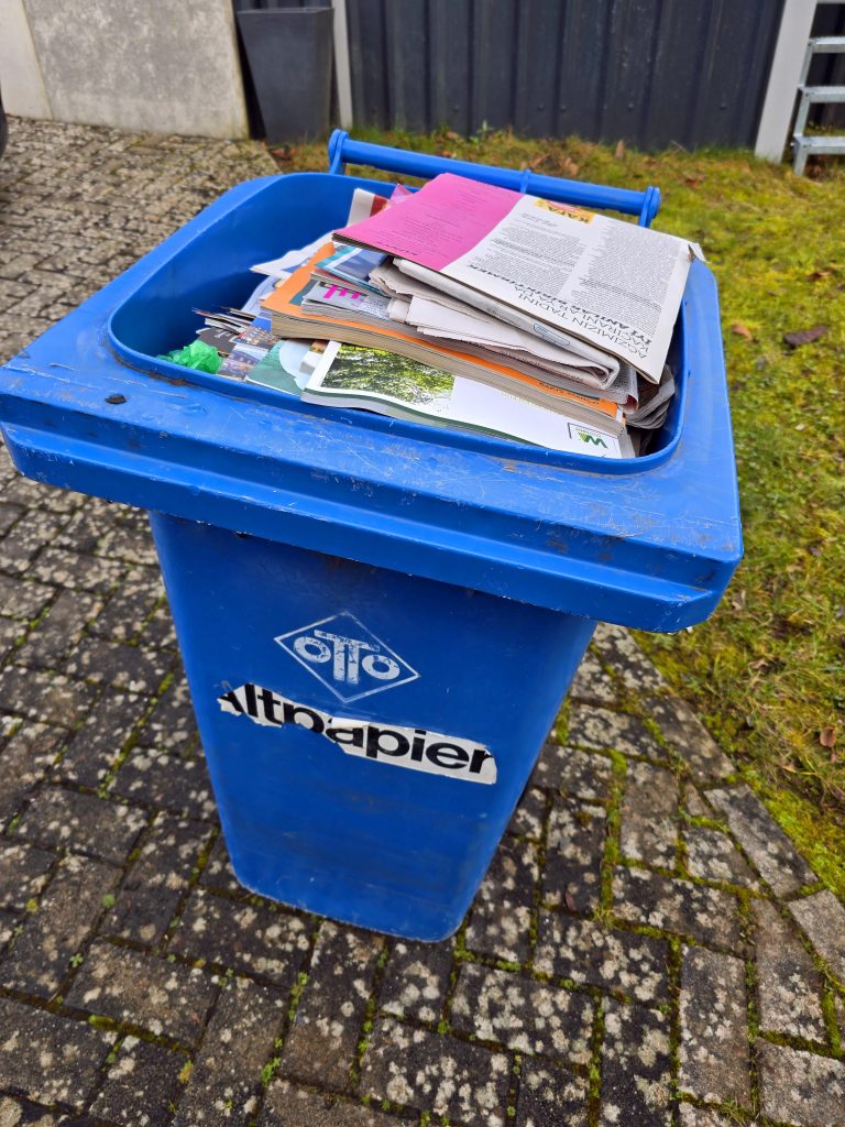 Weihnachten und Silvester sind gerade vorbei, es fällt Papier an und das nicht zu knapp. Zum Glück gibt es Tonnen die zu festgelegten Zeiten abgeholt werden. Was aber tun, wenn nicht? In unserer Region stehen sie schon mindestes ein paar Wochen gut gefüllt an den Straßen. Die Papierberge türmen sich in den Hausfluren und das ärgert die Menschen. Ob es wohl daran liegt, dass die Mitarbeiter des Entsorgungsunternehmen ihren bestimmt verdienten Weihnachtsurlaub machen oder ob sie von Grippeviren in die waagrechte befördert wurden, wer weiß es.