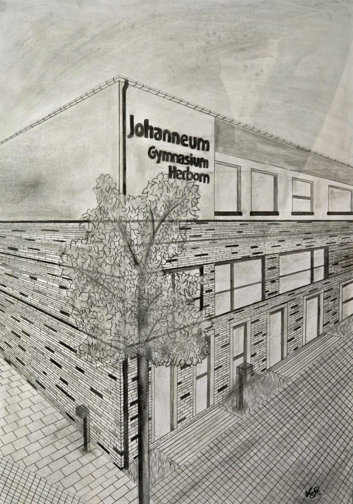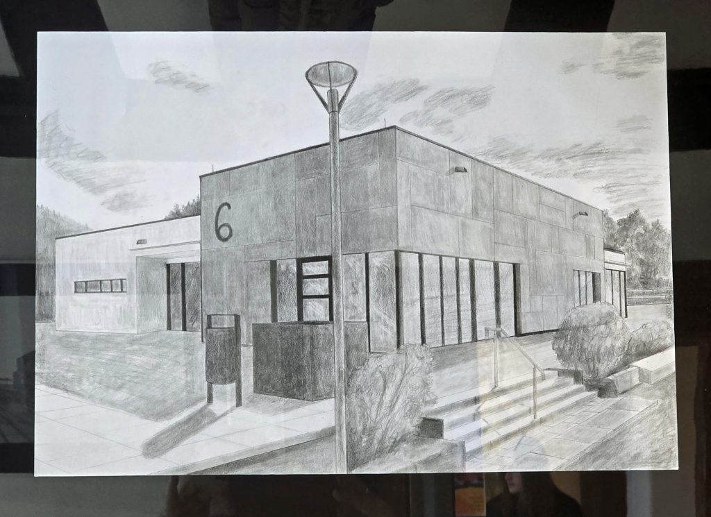 Für die Fluchtpunkt‑Perspektiven diente das Johanneum‑Gebäude selbst als Motiv. Die präzisen Bleistiftzeichnungen wirken auf den ersten Blick fast wie Fotografien. Rund zehn Stunden habe eine dieser Arbeiten gedauert, erzählten die beiden jungen Künstlerinnen – und selbst zu Hause sei weitergearbeitet worden.
