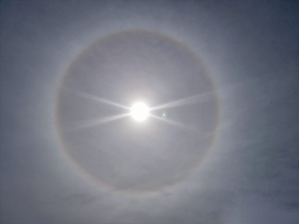 Das Glück eine Halo-Erscheinung in voller Ausprägung zu sehen und fotografieren zu können , erlebt man nicht jeden Tag. Ich hatte das Glück und war begeistert. Die Sonne schien vom fast blauen Himmel und ein paar Schleierwolken standen am Firmament. Plötzlich, ich traute meinen Augen nicht, gab es eine Himmelserscheinung, die ich noch nie gesehen hatte. Natürlich war die Spiegelreflexkamera nicht zur Hand, aber das Handy. Wahrscheinlich sollte es so sein, weil die Aufnahmen sehr gut wurden. Ja, auf die KI der modernen Handys kann man sich verlassen.