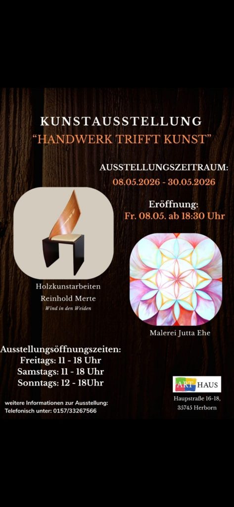 Während die gebürtige Haigerer Kunstmalerin Jutta Ehe ihre gemalten Werke vorstellt, kommt der namhafte Holzkünstler und Obermeister des Schreinerhandwerks Reinhold Merte mit seinen neusten Ideen in Massivholz. Die Ausstellung geht bis zum 30. Mai, so dass genügend Gelegenheit besteht die herausragenden Werke der Künstler zu bewundern. sig