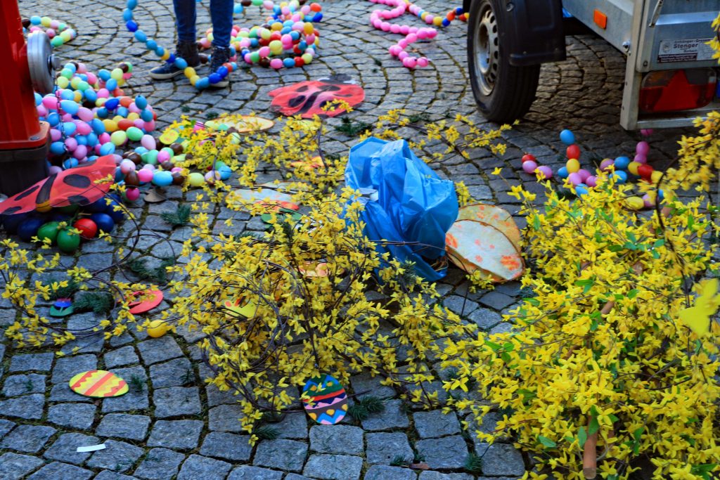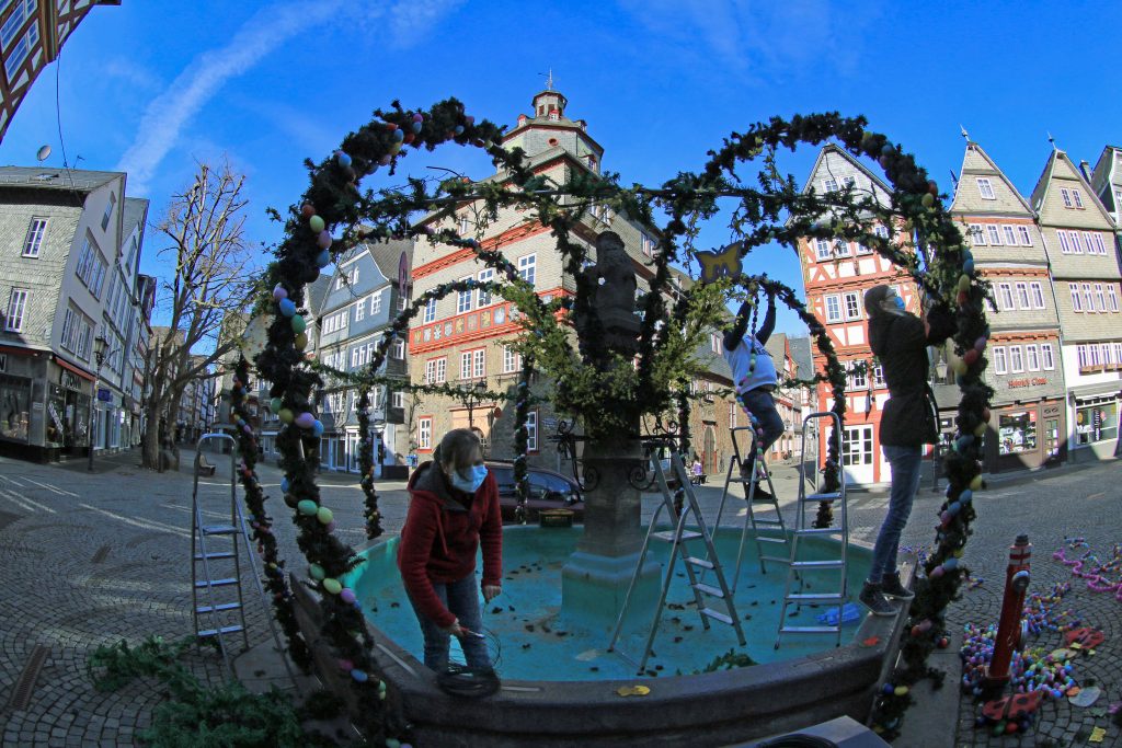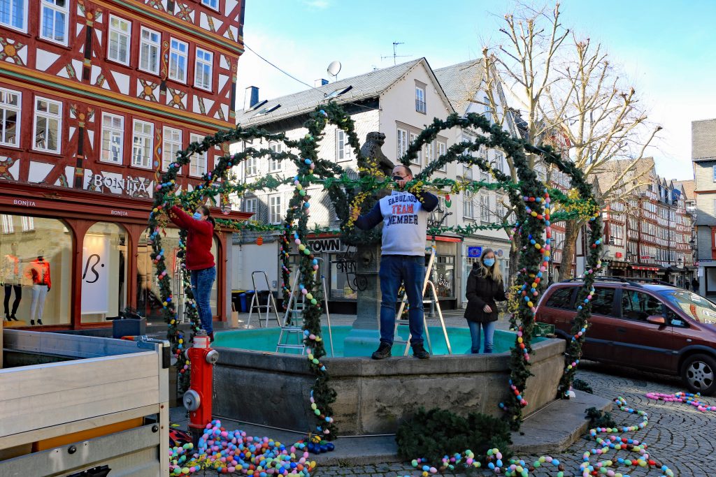 „Papa, ist heute Ostertag“, fragt der kleine Mann mit Blick auf die fleißige Schmück-Kolonne am Herborner Marktplatzbrunnen. “ Nein mein Junge, die Leute schmücken den Brunnen für Ostern, aber das Fest ist erst in 14 Tagen“, belehrte ihn der Vater. Anke Freiberg (48) von den „Essensrettern“ aus Herborn-Burg hatte sich am Samstag (Frühlingsanfang) bei strahlendem, aber empfindlich kaltem Wetter mit Janina Schmitt (28) und Dominik Diener (38) ans Werk gemacht, um den „Osterbrunnen“ wieder ins rechte Frühlingslicht zu rücken. Das Equipment steuerte der Herborner Werbering bei und vom Rathaus kam das OK für die ehrenamtliche Arbeit. Unzählige bunte (Plastik)-Eier und wunderbar blühende (Plastik)-Forsytien galt es um die Bügel zu schlingen und gekonnt daran zu befestigen. Weil alles unter strengen Corona-Bedingungen stattfinden musste, war die Arbeit ein Stück schwieriger als sonst. Anke Freiberg, die seit der Kommunalwahl am vergangenen Sonntag einen Sitz im Burger Ortsbeirat hat, wollte nicht wie 2020 auf den Brunnenschmuck verzichten und hatte sich bereit erklärt, die Ausgestaltung mit ihrem Team zu übernehmen. sige/Fotos: Gerdau