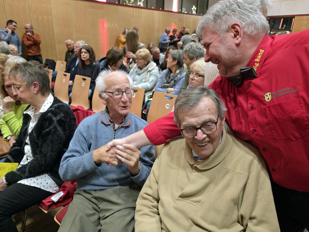 Neben Bürgermeister Luka Winkler freuten sich die Konzertveranstalter auch zwei ganz besondere Gäste begrüßen zu dürfen. Der ehemalige Stadtkämmerer Edwin Jung (98) und sein Alterskamerad und musikalisches Urgestein Rudi Bickel verfolgten das Weihnachtskonzert der Big Band mit sehr viel Interesse. Rudi Bickel gab allen Gästen noch den Tipp ein Musikinstrument zu spielen. „Damit werdet ihr so alt wie ich“, verkündete er unter dem Beifall der Anwesenden.