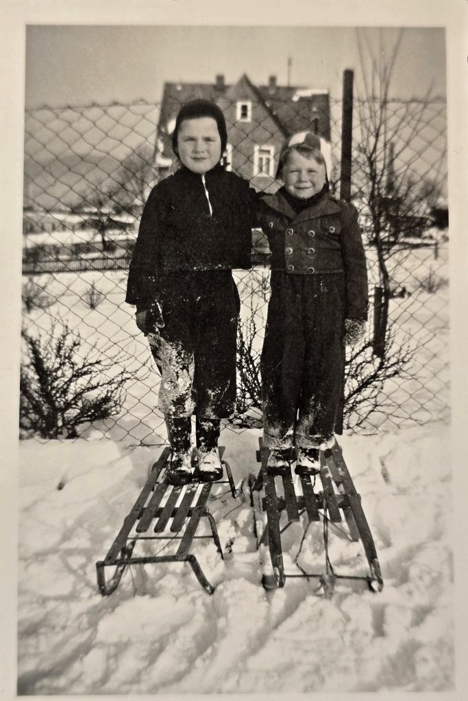 Einmal fuhren wir mit dem Zug, der von einer Dampflok gezogen wurde, nach Siegen. Ich sollte einen Bleyle-Pullover zu Weihnachten bekommen und freute mich aber fast mehr über die Bahnfahrt. Die harten Holzbänke störten nicht und wenn man das Fenster aufmachte und heraus sah, war das Gesicht fast so schwarz wie das des Heizers. Die Stadt an der Sieg erschien mir riesenhaft und ich konnte die Pracht um mich herum gar nicht alle aufnehmen. Papa durfte sich noch einen geräucherten Bückling kaufen und Mama passte auf, dass die wenigen Markstücke zusammenblieben.