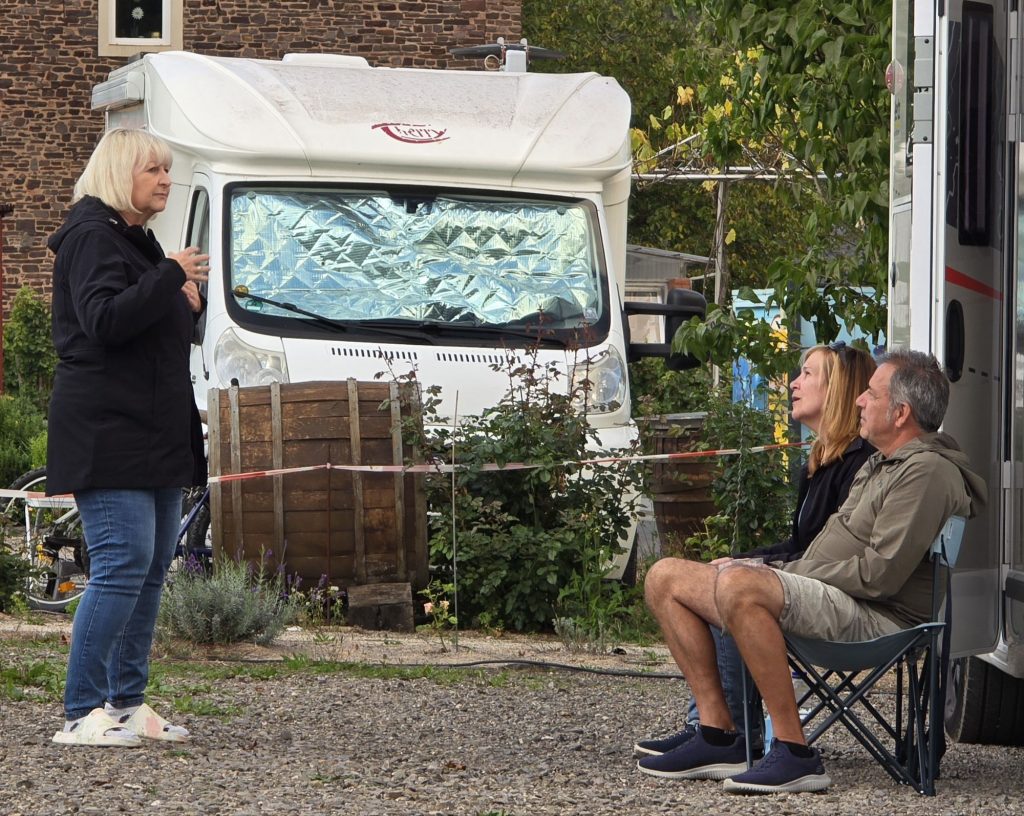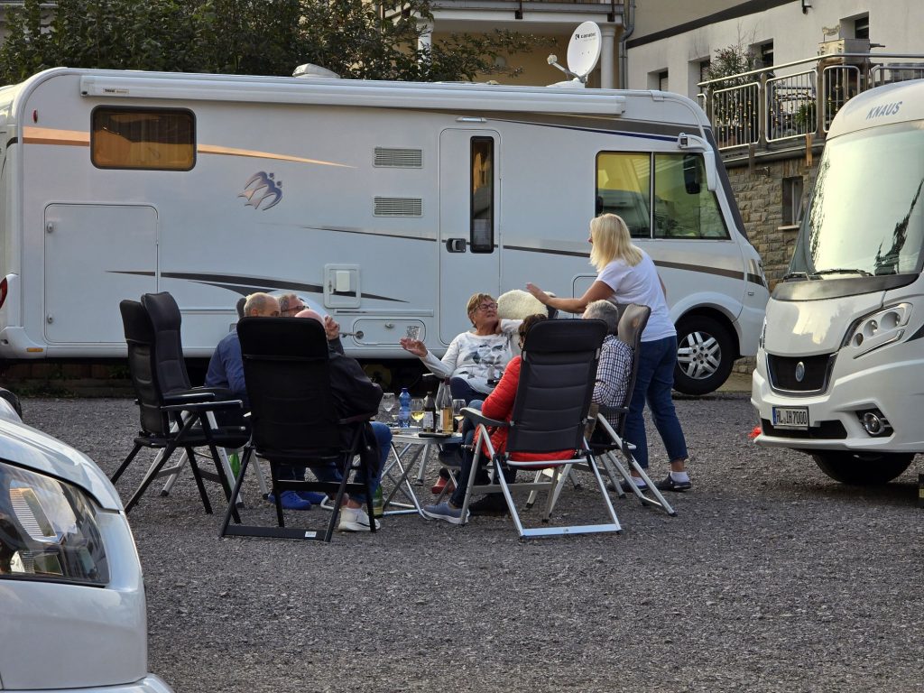 Etwas weiter hat sich ein „Stuhlkreis“ etabliert und die meisten der Teilnehmer outen sich unüberhörbar als Wohnmobilisten aus NRW. Udo Loosen hat heute seine gemütliche Straußenwirtschaft nur bis 19 Uhr geöffnet. Claudia: „Wir müssen ja auch einmal in der Woche kürzer treten.“